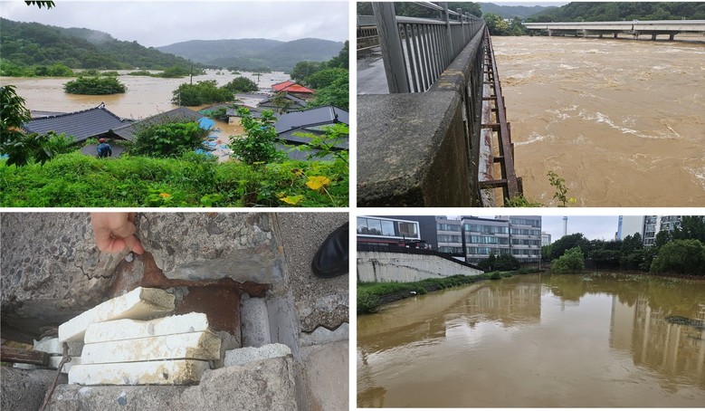 | ▶(上·左∼)남강댐 사천방면 방수로 바로 앞 방류로 인한 진주 양옥마을 침수('20.8.)▶남강댐 사천방면 방수로 바로 앞에 있는 1963년 건설된 삼계교(왼쪽). 바로 오른쪽에 국도 2호선인 가화천교가 있어 삼계교 붕괴시 동반붕괴가 예상됨 ▶(下·左∼)삼계교에 매립되어 있는, 하동 주요시설로 가는 수도관 상태 ▶백워터 현상으로 흐르지 못하는 가좌천('25.7.) |