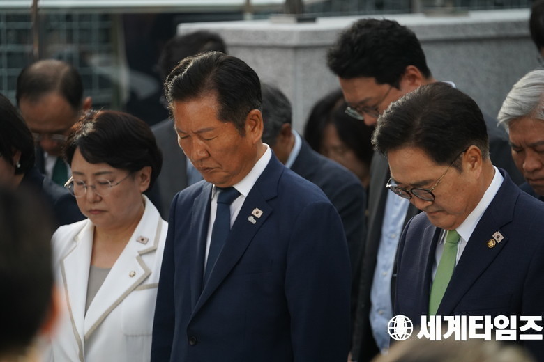 '우원식' 국회의장과 더불어민주당 '정청래' 대표, '김선민' 조국혁신당 당대표권한대행이 14일 서울 영등포구 국회도서관 앞에서 열린 독립기억광장 제막식에서 순국선열에 대한 묵념을하고있다.