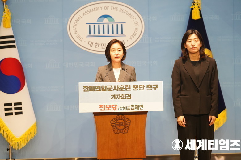 '김재연' 진보당 상임대표가 10일 서울 여의도 국회 소통관에서 열린 한미연합군사훈련 중단 촉구 진보당 기자회견에서 발언을 하고 있다.