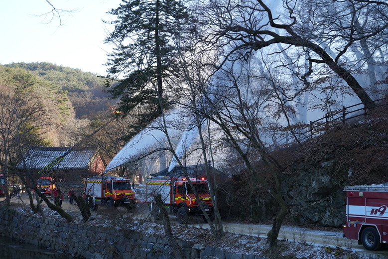 | ▲ 사진 공주 마곡사 산불대응 훈련에서 험지펌프차량이 방수하며 진입하고 있는 모습(2025.12.5.) |