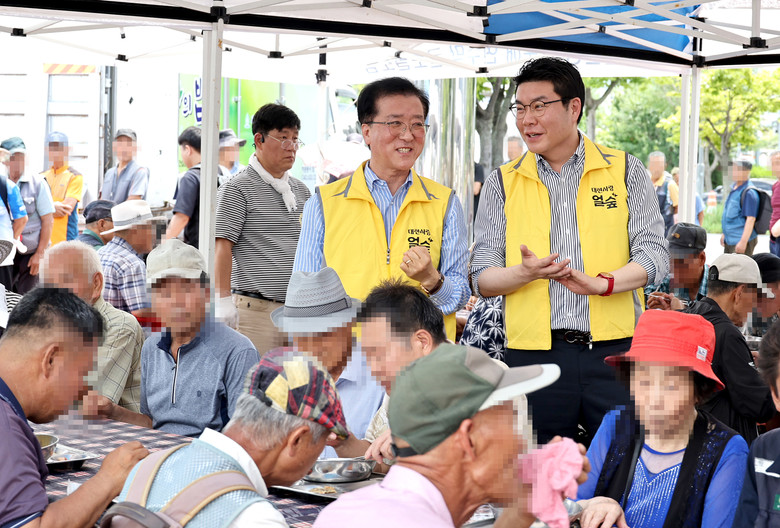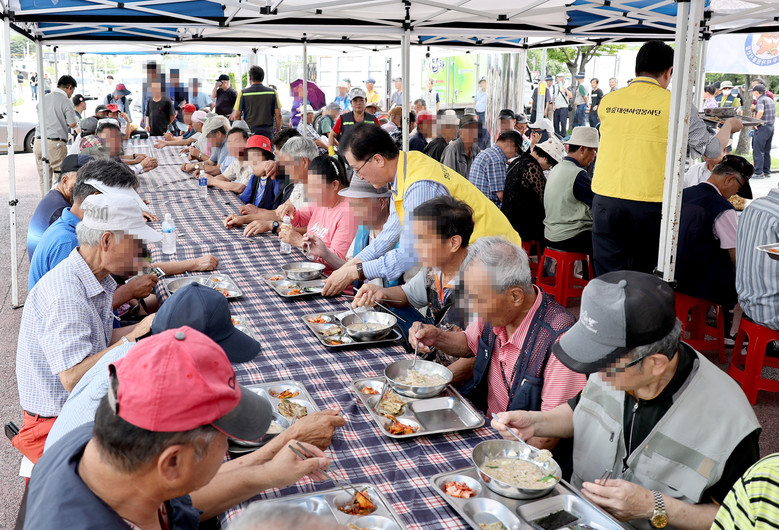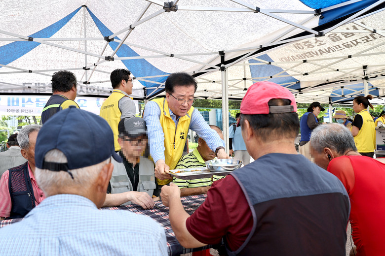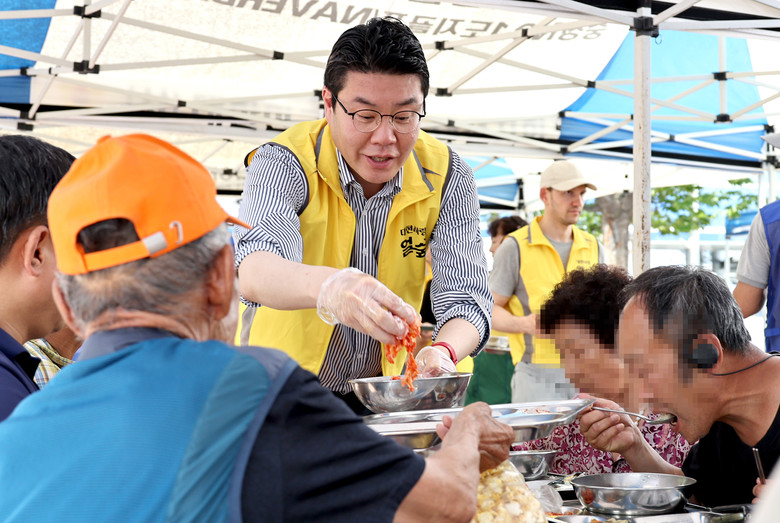[대전 세계타임즈=이채봉 기자] 대전시의회 조원휘 의장은 28일 대전역 동광장 일원에서 개최된 대전곰두리 자원봉사연합 주관 ‘나눔과 희망의 밥차’행사에 정명국 행정자치위원장과 참석해 자원봉사자들을 격려하는 가운데, 노숙인 등 300여명의 소외계층을 대상으로 삼계탕 급식봉사를 실천했다.
