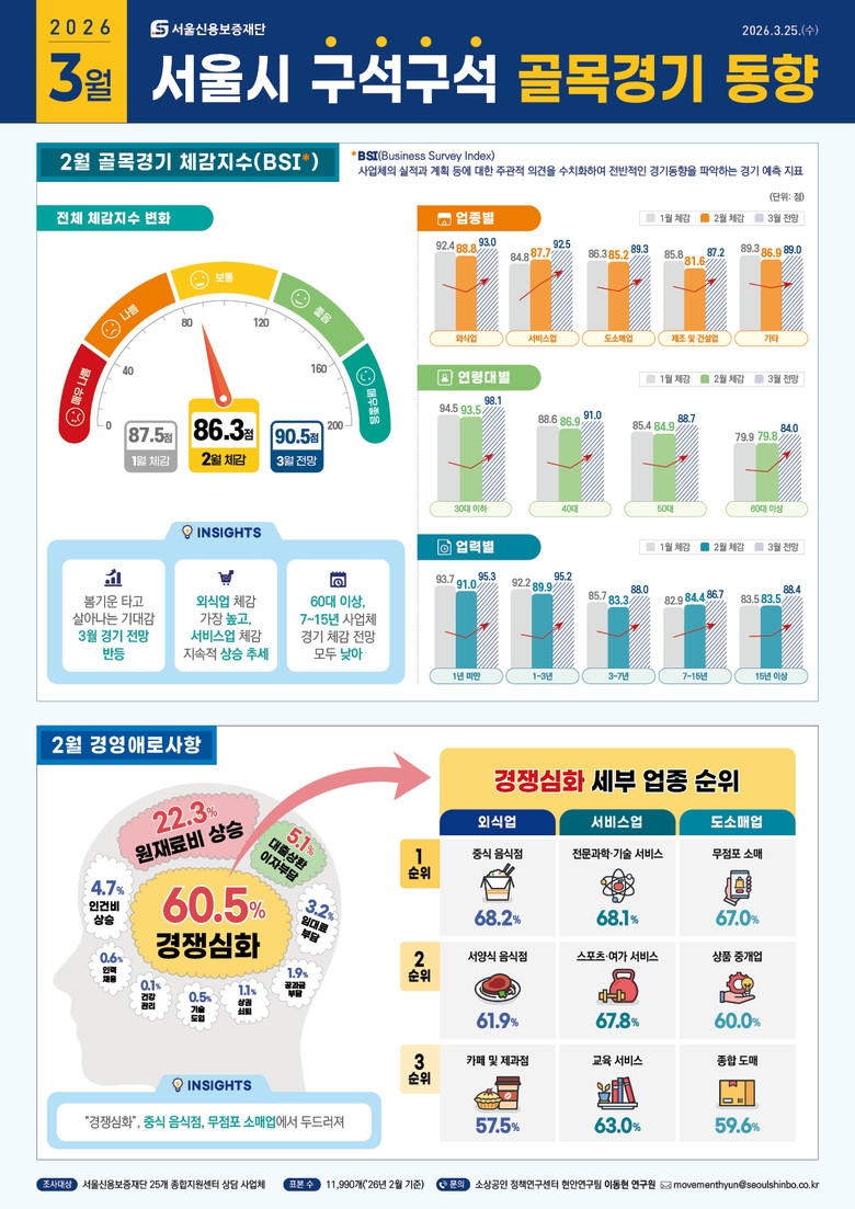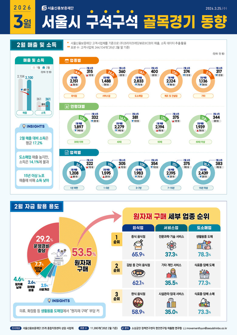 서울신보는 소상공인의 업종.업력.연령별 매출.소득과 세부 업종별 경영애로 및 자금 활용 분석을 새롭게 추가한「서울시 구석구석 골목경기 동향」3월호를 지난 25일 발표했다.