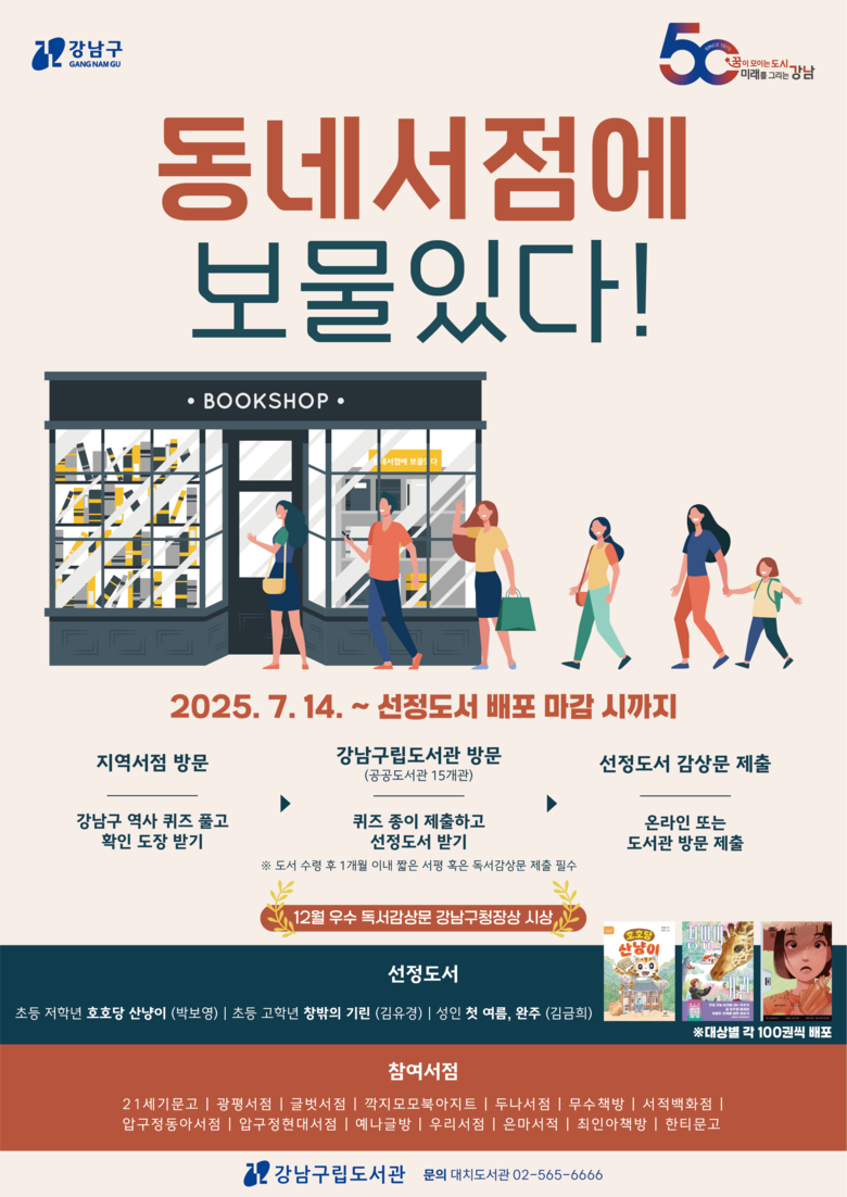 조성명 강남구청장은 “이번 프로그램을 통해 가까이 있는 지역 서점을 재발견하고, 도서관 이용을 활성화할 수 있길 바란다”며 “책을 중심으로 일상과 공간, 관계를 잇는 독서문화가 더욱 깊이 뿌리내릴 수 있도록 앞으로도 다양한 시도를 이어가겠다"고 밝혔다.