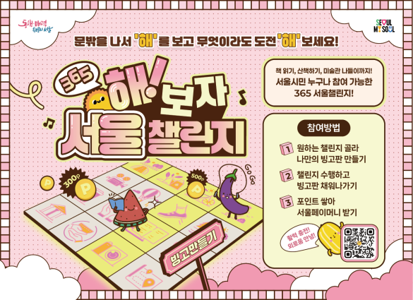 이번 서울챌린지는 “문밖을 나서 ‘해’를 보고 무엇이라도 도전‘해’ 보자” 콘셉트로, 분리수거, 집 앞 운동과 같은 일상 속 간단한 실천부터 서울둘레길 걷기, 미술관 관람 등 보다 적극적인 활동까지 다양하게 구성해 참여에 재미를 더하고 있다. 특히 참여자가 원하는 16개의 챌린지를 직접 선택해 ‘나만의 빙고판’을 만들고, 빙고게임 형식으로 즐길 수 있도록 한 점이 인기에 큰 요인으로 작용했다.