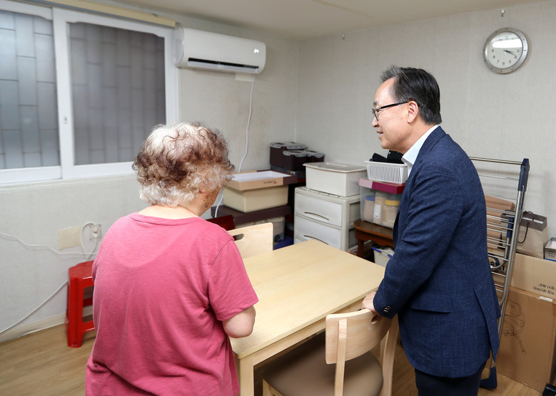 | ▲ 유성훈 금천구청장이 에어컨 설치 지원을 받은 취약계층 가구를 방문하여 안부를 살피고 있다. |