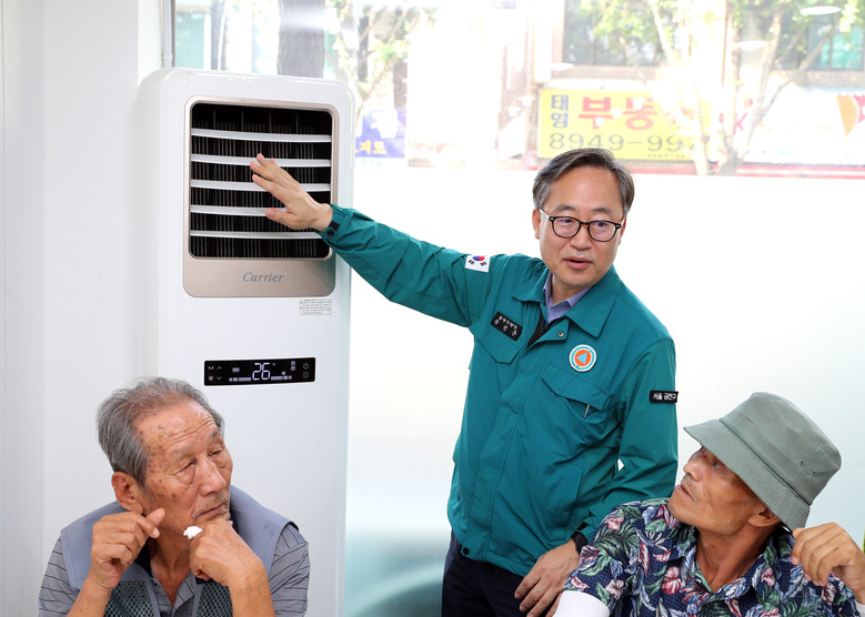 | ▲ 유성훈 금천구청장이 어르신 쉼터를 찾아 에어컨을 점검하고 있다. |