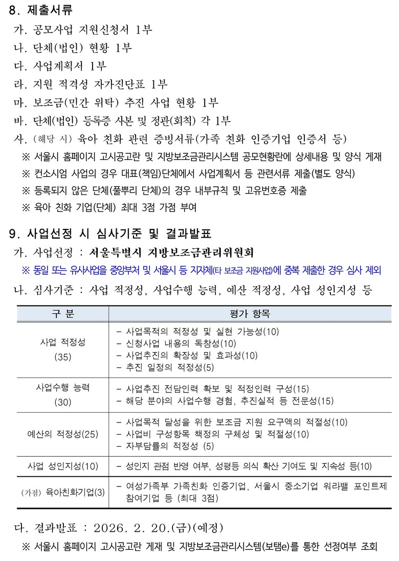 서울시는 사전 신청한 단체들을 대상으로 오는 14일(수) 사업설명회를 개최할 예정이다. 사업설명회에서는 사업내용, 신청방법(지방보조금관리시스템(보탬e)), 심사기준, 사업 능력이 없거나 부적정한 단체 참여 배제를 위한 현장점검 등을 상세히 설명할 예정이다.