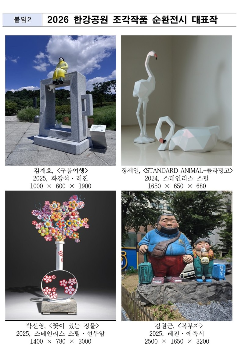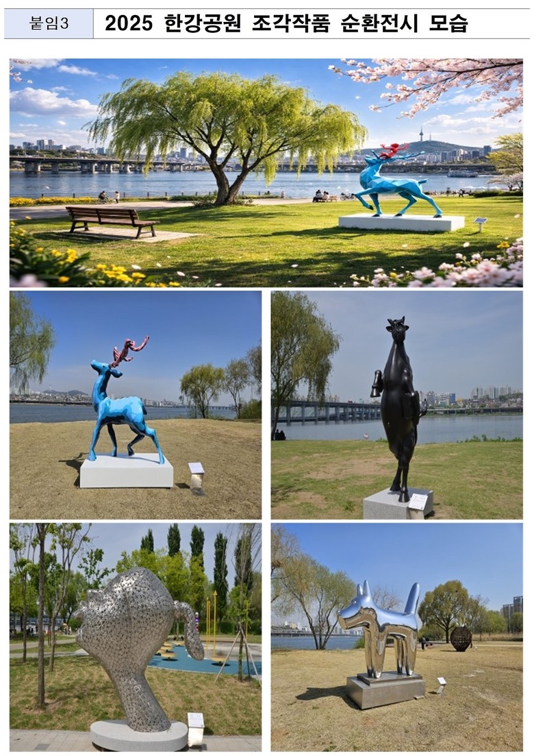 ‘한강공원 조각작품 순환전시’와 관련된 자세한 내용은 누리집(K-Sculpture.com)과 인스타그램(@hangang_sculpture_project)에서 확인할 수 있다.