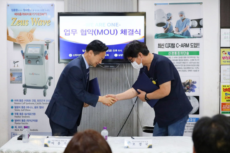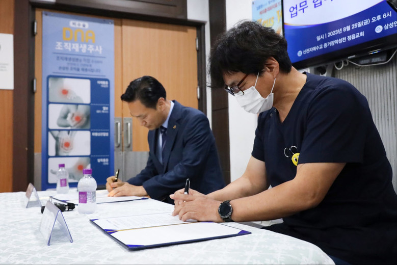 | ▲이용우 정읍교회 담임강사와 삼성연합정형외과병원 오경국 사무국장이 협약서에 서명을 하고 있다 |