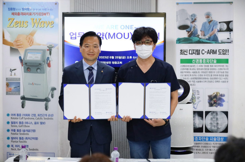 | ▲이용우 정읍교회 담임강사와 삼성연합정형외과병원 오경국 사무국장이 협약서를 선보이고 있다 |