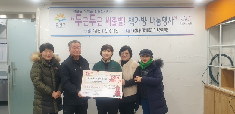 이번 책가방 나눔은 독산4동 희망마을기금 운영위원회(운영위원장 강신환)에서 진행하는 것으로, 입학을 앞두고 신학기 준비에 경제적 어려움을 겪는 가정을 지원하는 것이다. 독산4동 희망마을기금 운영위원회는 2016년 레미콘이 관내 골목 전봇대를 들이 받으면서 일어난 화재에 대해 건축회사에서 위로금으로 기부한 2,000만 원으로 조직됐다. 독산4동 취약계층 주민을 위해 명절 떡국떡나눔, 산타행사 등 후원 활동을 하며 희망을 전하고 있다. 2020년부터 6년째 아름다운 나눔이 이어지고 있다.