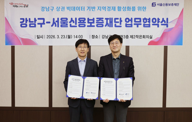 [서울 세계타임즈=이장성 기자] 꿈이 모이는 도시, 미래를 그리는 강남구(구청장 조성명)가 3월 23일 구청에서 서울신용보증재단(이사장 최항도)과 업무협약을 체결하고, 지역상권 활성화와 소상공인 지원을 위한 빅데이터 기반 협력체계 구축에 나섰다. 상권 현황을 보다 정밀하게 분석해 지역 특성에 맞는 정책을 발굴하고, 소상공인이 체감할 수 있는 지원책으로 연결하겠다는 취지다.