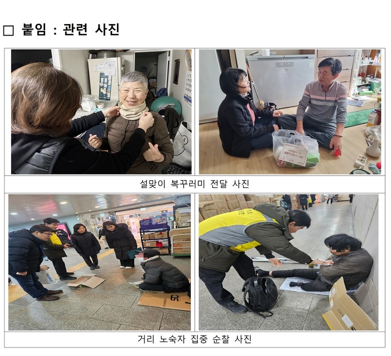 - 거리 노숙인에 설맞이 식료품과 생필품, 구호물품으로 구성된 명절 꾸러미 전달