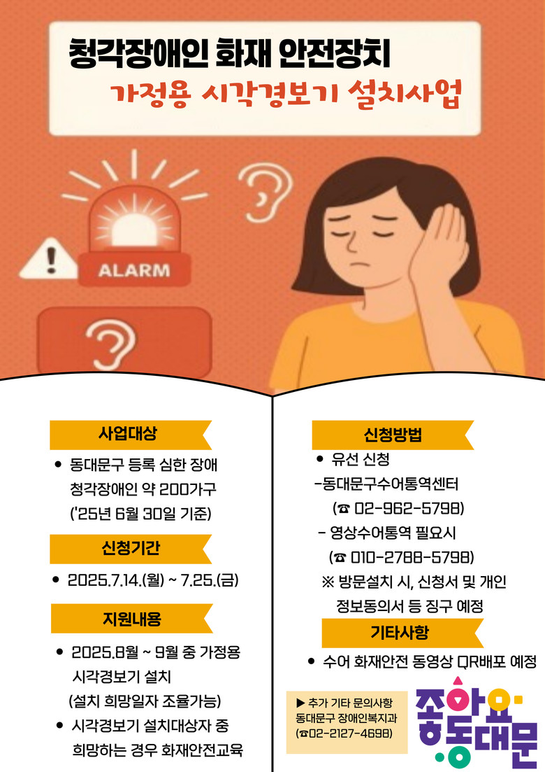 구는 청각장애인의 신청과 접수, 설치가 원활히 이뤄지도록 동대문구수어통역센터와 협력해 사업을 진행한다. 우선 심한 청각장애가 있는 약 408가구를 대상으로 우편으로 사업 안내를 발송하고, 오는 14일부터 25일까지 센터에서 유선 안내를 통해 신청 의사를 확인할 예정이다. 이후 우선순위 등을 종합적으로 고려해 최종적으로 약 200가구를 선정하고, 가정을 방문해 시각경보기를 설치한다.