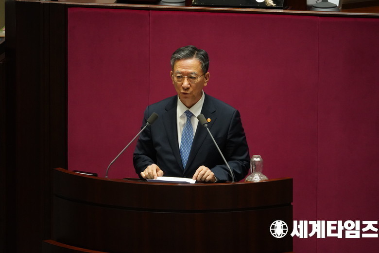 '정성호' 법무부 장관이 11일 국회 본회의에서 국민의힘 '권성동' 의원 체포동의안에 대해 제안설명을 하고 있다.