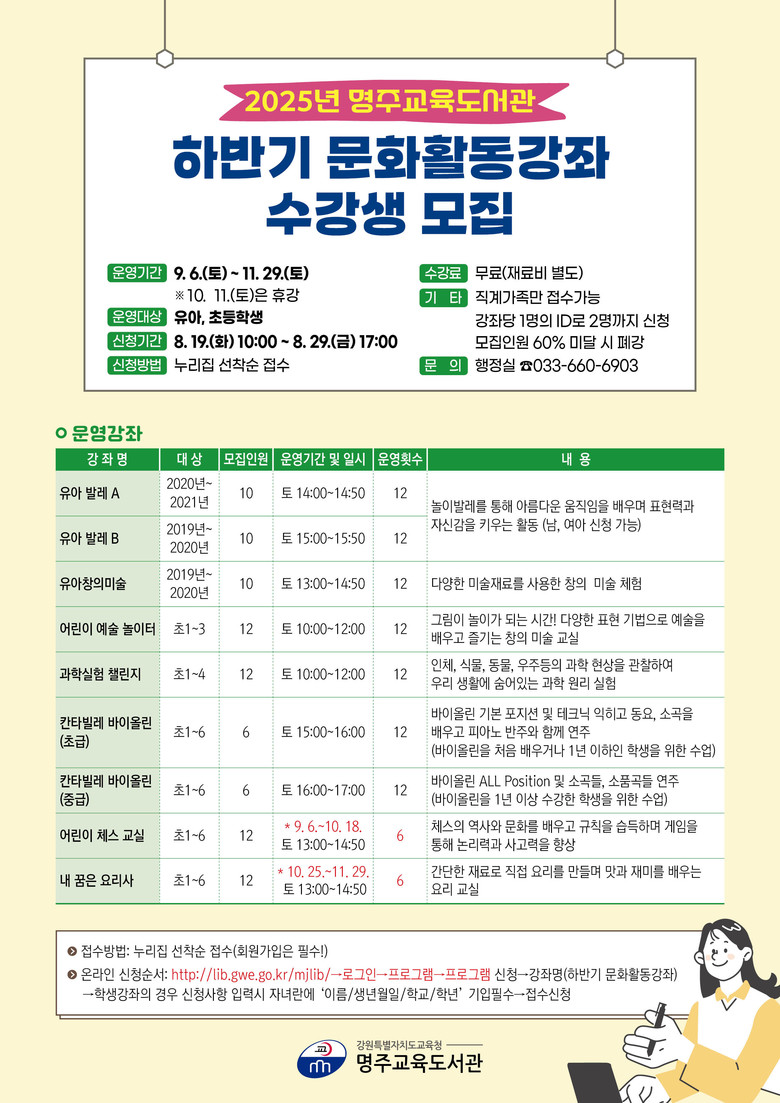 수강 희망자는 명주교육도서관 누리집(http://lib.gwe.go.kr/mjlib)에서 회원가입 후, 프로그램/프로그램신청에서 강의계획을 확인하고 신청하면 된다.