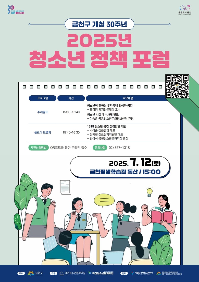 - 청소년 표적집단면접법(FGI) 결과부터 제안 발표, 현장 토론까지 실질적 논의 [금천구 세계타임즈=이장성 기자] 금천구(구청장 유성훈)는 오는 7월 12일(토) 15시, 금천평생학습관 독산에서 ‘2025 금천구 청소년 정책 포럼’을 개최한다고 밝혔다.