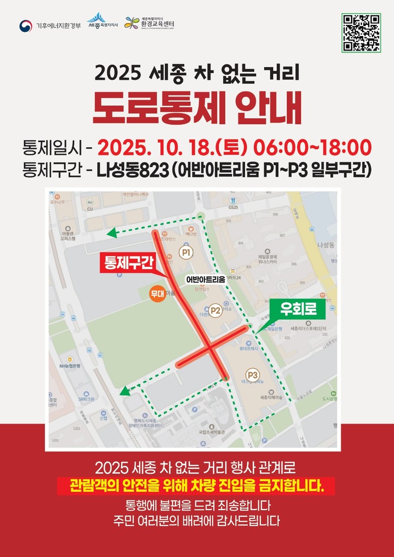 이날 한마당 행사가 진행되는 18일 오전 6시부터 오후 6시까지는 나성동 어반아트리움과 백화점 부지 사이 약 400m 구간 도로에서 차량이 통제된다.