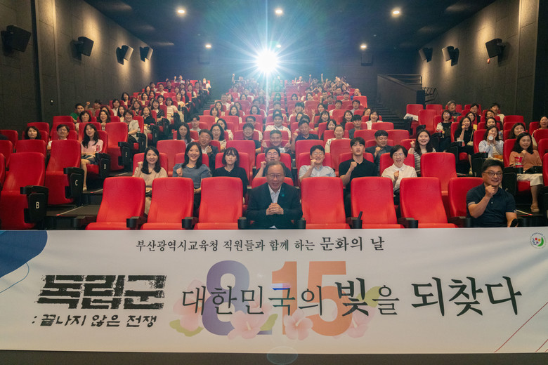 [부산 세계타임즈=이용우 기자] 부산광역시교육청(교육감 김석준)은 광복 80주년을 기념하고 ‘2025년 직원문화행사의 날’을 겸해 지난 13일 오후 7시 CGV 아시아드에서 교육청 소속 직원 200여 명을 대상으로 영화 ‘독립군: 끝나지 않은 전쟁’을 단체관람하였다.