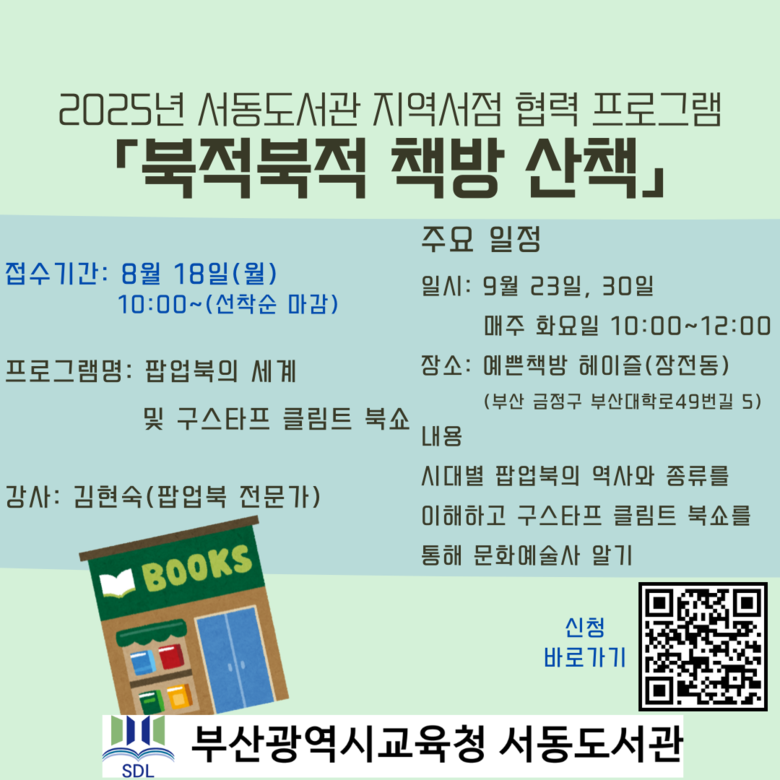 프로그램은 ▲이름 찾기 에세이 클래스와 ▲팝업북의 세계 및 구스타프 클림트 북쇼 2개 강좌로 구성했다. ‘이름 찾기 에세이 클래스’는 지역서점 동사서독(금정구 장전동)에서 자신을 돌아보는 에세이 쓰기를 통해 주체적인 시선을 길러준다. ‘팝업북의 세계 및 구스타프 클림트 북쇼’는 예쁜책방 헤이즐(금정구 장전동)에서 시대별 팝업북의 역사와 문화예술사를 알아보는 강의로 진행한다.
