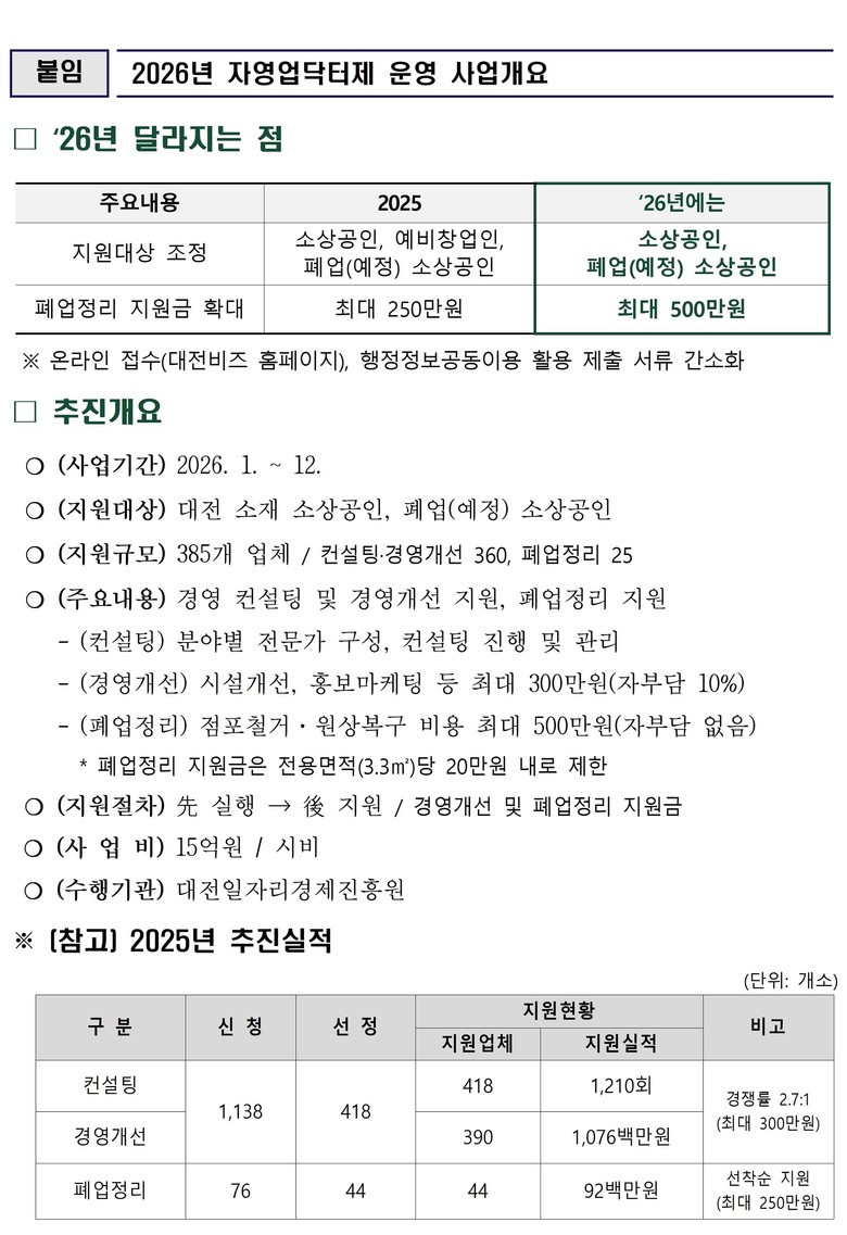[대전 세계타임즈=이채봉 기자] 대전시는 소상공인의 경영 회복과 안정적인 재도약을 지원하기 위해 ‘2026년 자영업닥터제’ 사업을 본격 추진한다.