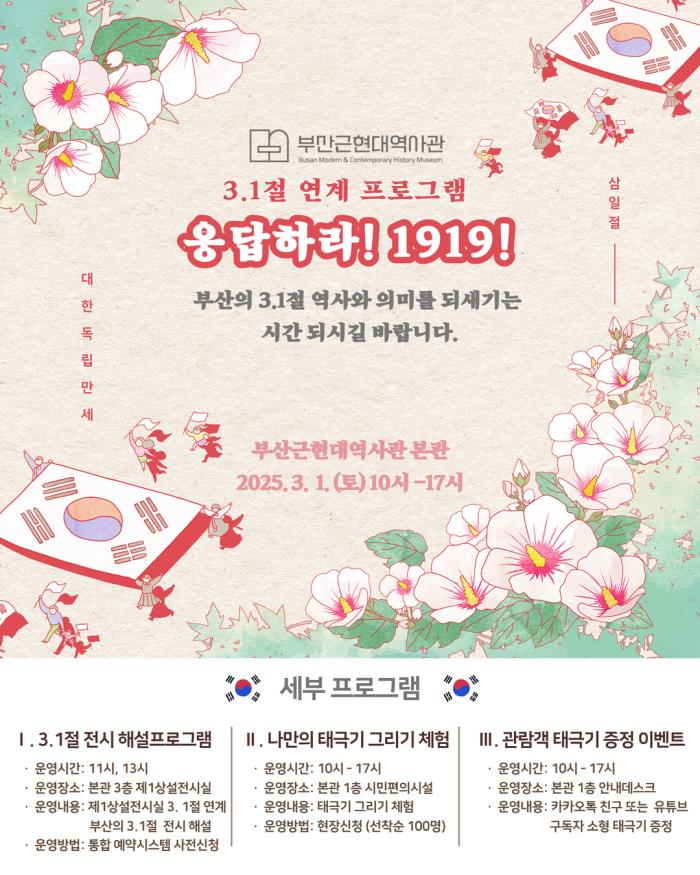 김기용 부산근현대역사관장은 “이번 프로그램을 통해 부산근현대역사관에서 삼일절의 역사와 의미를 되새기는 시간이 되시길 바라며, 시민이 그린 삼일절 태극기가 다가오는 광복 80주년에 아름답게 펄럭이기를 바란다”라고 전했다.