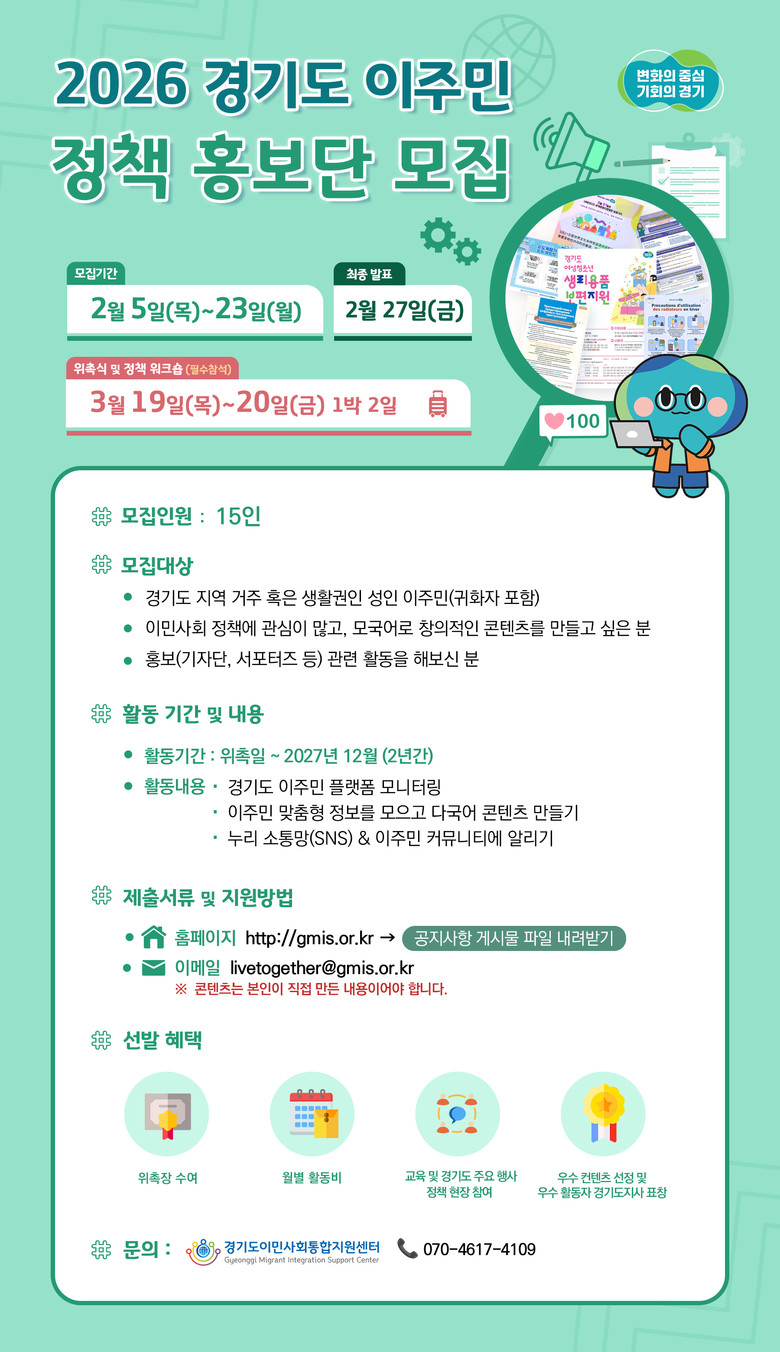 ○ 이주민 정책 정보 다국어 전달 및 SNS 활용 홍보 활동 수행 [경기북부 세계타임즈=송민수 기자] 경기도이민사회통합지원센터에서 오는 23일까지 ‘2026 경기도 이주민 정책 홍보단’ 15명을 모집한다.