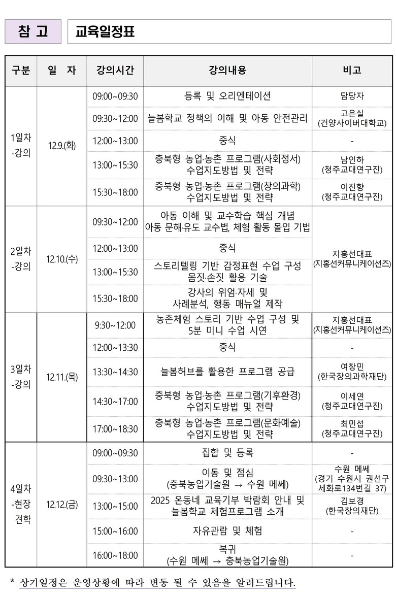 도 농업기술원 피정의 과장은 “이번 양성과정은 충북의 농업·농촌 자원을 교육적으로 활용해 늘봄학교 운영을 더욱 풍성하게 만드는 기반이 될 것”이라며, “전문성과 실무능력을 갖춘 강사를 지속적으로 양성해 아이들이 안전하고 의미 있는 농촌체험을 누릴 수 있도록 적극 지원하겠다”라고 말했다.