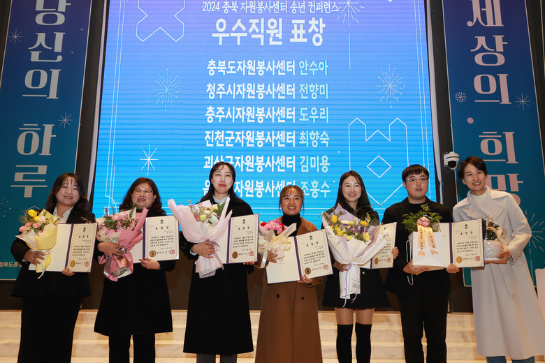 올해 자원봉사센터 우수직원으로는 △도 종합자원봉사센터 안수아 △청주시자원봉사센터 전향미 △충주시자원봉사센터 도우리 △진천군자원봉사센터 최향숙 △괴산군자원봉사센터 김미용 △음성군자원봉사센터 조흥수 씨가 선정되어 도지사 표창을 받았다.