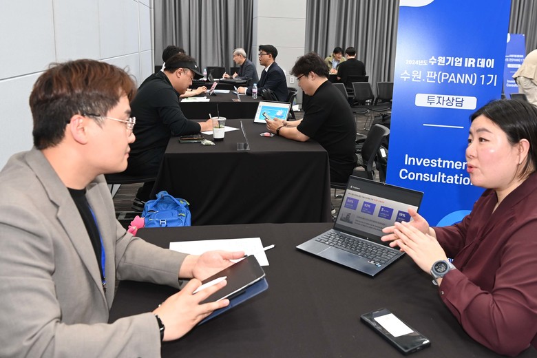 | ▲ 수원시가 개최한 수원기업IR데이.판(PANN)에 참가한 기업과 투자자가 투자 상담을 하고 있다. |