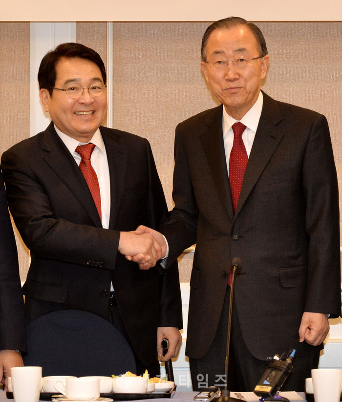 반기문 전 유엔 사무총장이 25일 오전 서울 여의도 국회에서 심재철 국회 부의장 초청으로 '왜 정치교체인가'를 주제로 한 간담회에 참석하여 심 부의장과 인사를 나누고 있다. 2017.01.25.