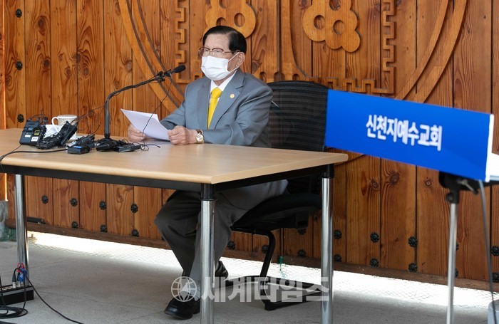 2일 오후 경기도 가평 평화연수원에서 열린 코로나19 관련 신천지예수교회 기자회견에 참석한 이만희 신천지예수교회 총회장이 입장발표를 하고 있다. 2020.03.02.