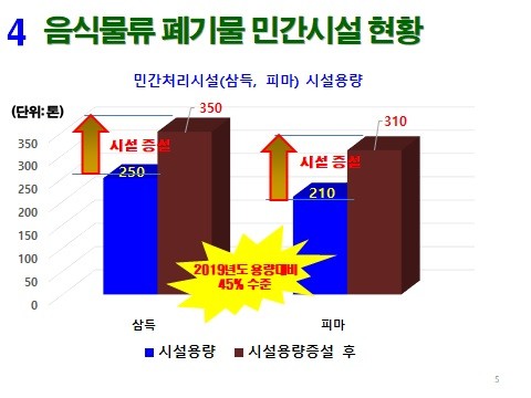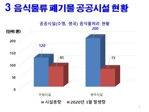 특히, 공공시설인 수영시설은 시설용량 120톤 처리규모를 가지고 있지만 2020년 3월까지 약83톤 처리하고 있으며, 생곡시설은 200톤 규모에 약 73톤 처리에 불가하여 대부분 공공시설과 민간시설에서 시설용량 규모 절반에도 미치지 못하는 실정이다.