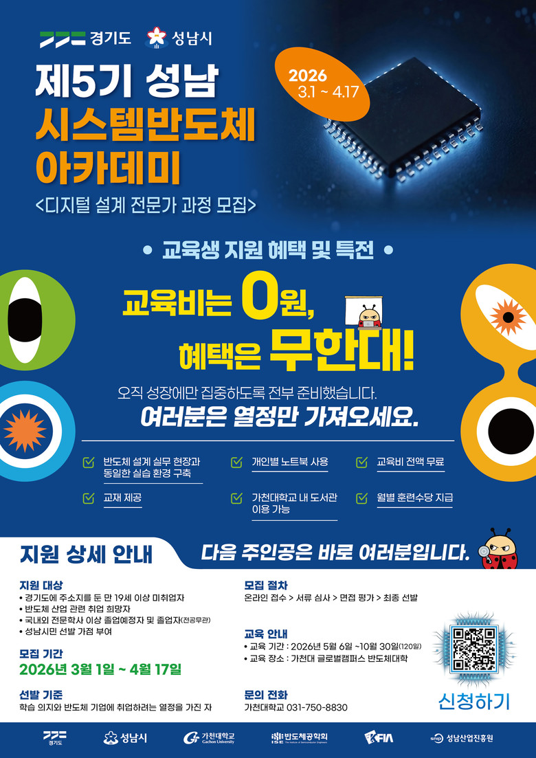 ‘성남시 시스템반도체 아카데미’는 성남시를 중심으로 가천대학교, 서강대학교, 한국폴리텍대학, 한국팹리스산업협회, 반도체공학회, 성남산업진흥원이 참여해 교육부터 취업 연계까지 원스톱으로 지원하는 인재 양성 프로그램이다.