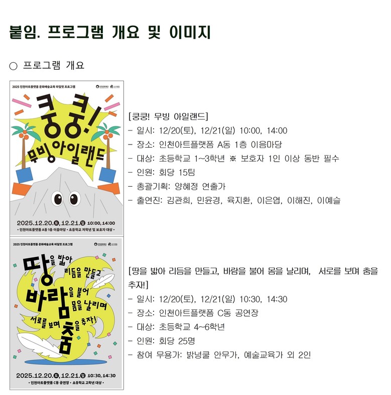 ○ 초등학생 및 학부모 대상, 무료 참여 가능한 신체 워크숍 [인천 세계타임즈=심하린 기자] (재)인천문화재단에서 운영하는 인천아트플랫폼은 12월 한 달간 초등 저학년 및 보호자, 초등학교 고학년 대상으로 신체 표현 기반의 예술교육 워크숍을 운영한다. 이번 프로그램은 어린이와 청소년이 예술가와 함께 몸을 매개로 직접 체험하며 창의적 표현을 경험할 수 있도록 구성되었다.
