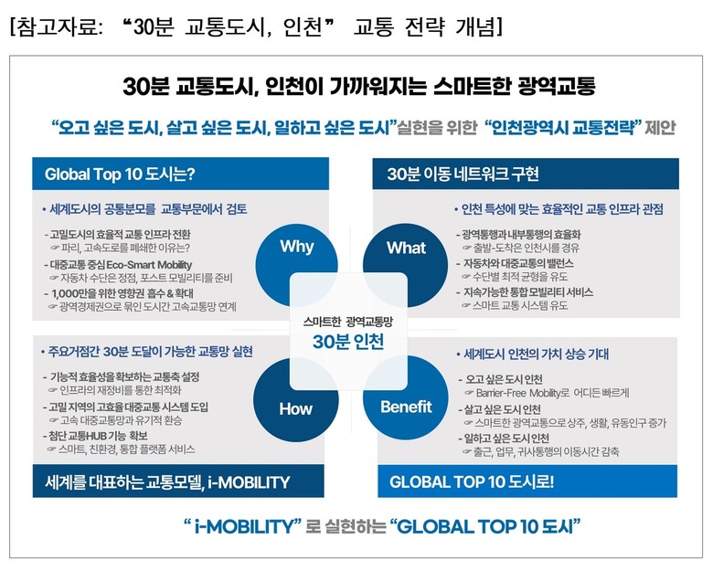 이에 인천 교통정책의 최적 대안으로‘광역 네트워크’와‘지역 맞춤형 수요’를 동시에 아우르는 30분 고속 대중교통축 구축을 핵심 방향으로 제시했다. 단일 노선 확충이 아닌 교통축 재편과 환승 혁신, 광역철도망 직결, 심야 이동권 보강을 포함한 통합 추진 전략으로 설계해야 한다는 점을 강조하고 있다.