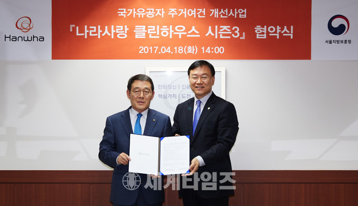 [세계타임즈 이채봉 기자]㈜한화는 18일 서울 장교동 한화빌딩 본사에서 서울지방보훈청과 '나라사랑 클린하우스 시즌3' 협약을 체결했다고 19일 밝혔다.