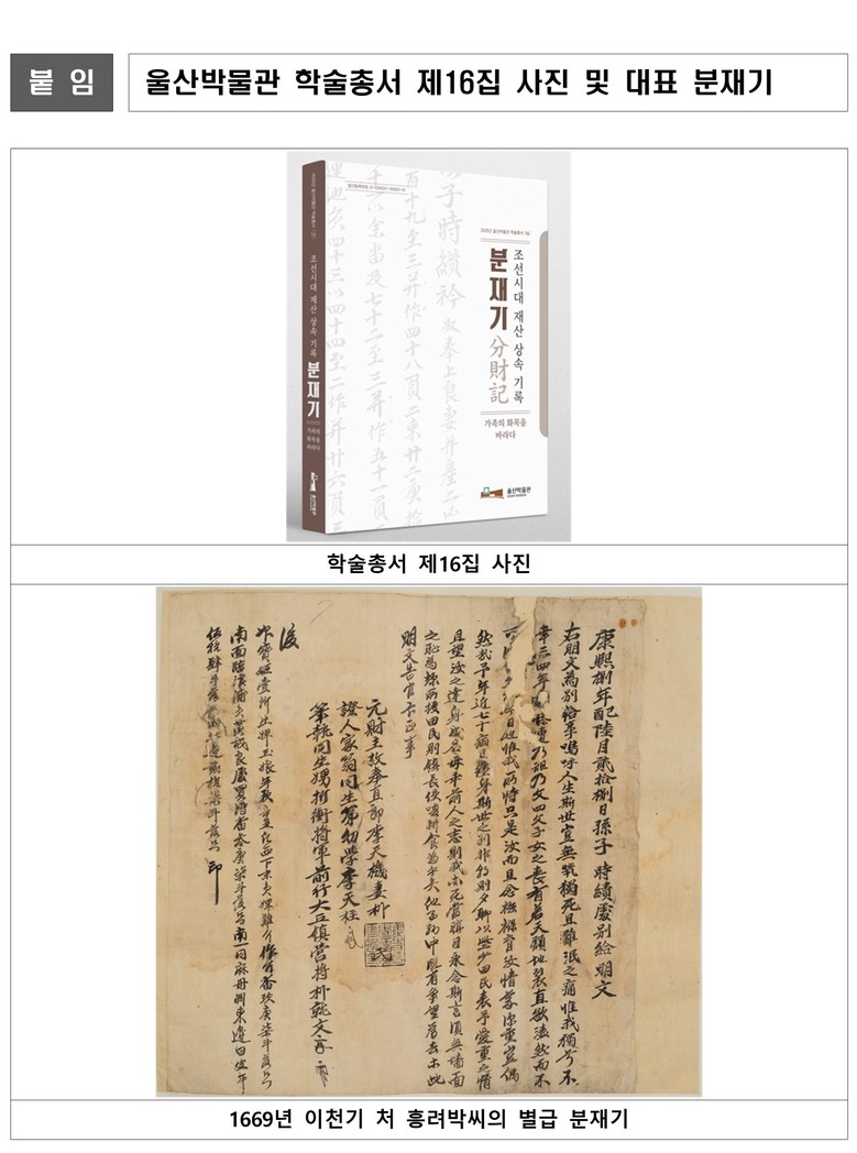 울산박물관 관계자는 “분재기에는 기록을 남긴 이가 남은 가족들이 혹여나 재산으로 다투지 않을까 하는 염려와 당부가 담겨 있다”라며 “이번 학술총서를 통해 조선시대 분재기에 담긴 가족의 화목을 바라는 마음이 잘 전달되기를 바란다”라고 말했다.