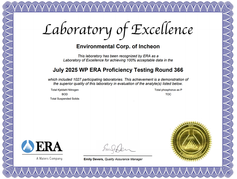 미국 환경자원협회(ERA)는 국제표준화기구(ISO/IEC 17043)의 공인을 받은 세계적 수준의 숙련도 평가기관으로, 매년 전 세계 환경시험·검사기관을 대상으로 데이터의 신뢰성과 정확도를 엄격하게 평가하고 있다.
