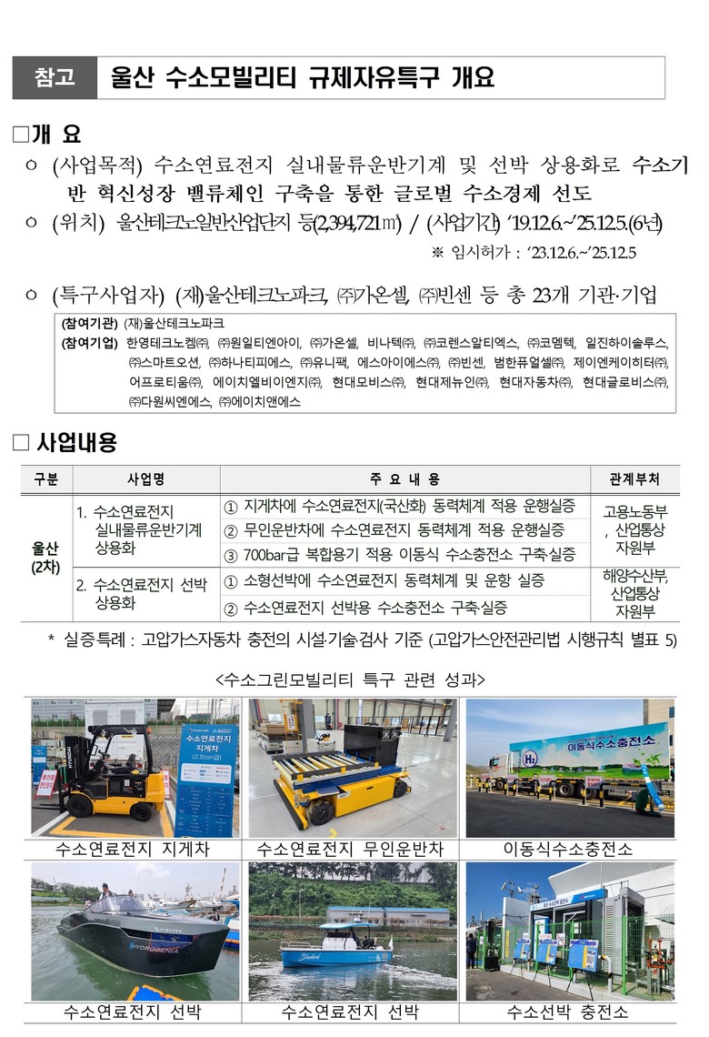 울산시 관계자는 “울산 특구 사업의 성공을 바탕으로 앞으로도 수소지게차, 수소선박 등 친환경 수소 이동수단(모빌리티) 상용화와 보급에 앞장서 나가겠다”라고 말했다.