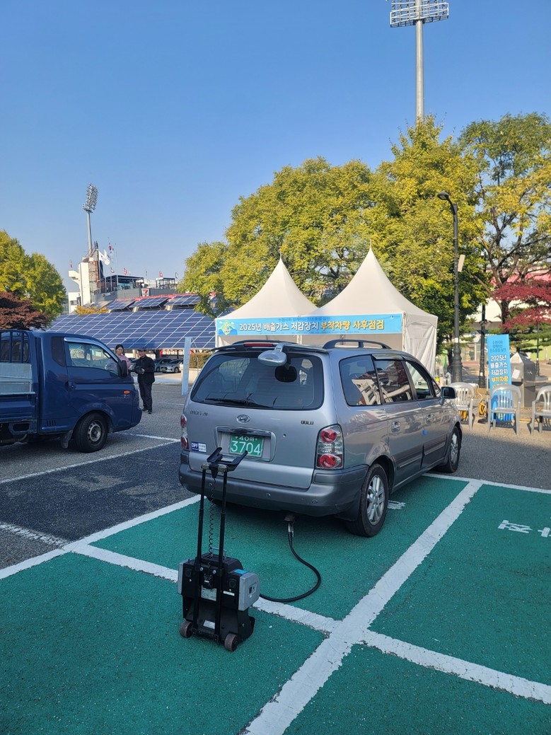| ▲ 수원시와 수도권대기환경청·저감장치 제작사가 수원종합운동장에서 합동점검을 하고 있다. |