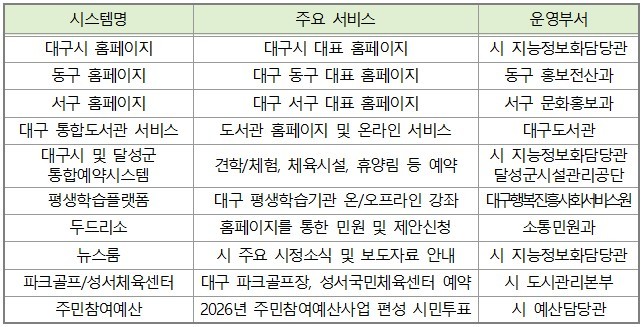 중단되는 주요 서비스는 대구시와 동·서구 홈페이지, 대구 통합도서관 서비스 등 총 10개 서비스다.