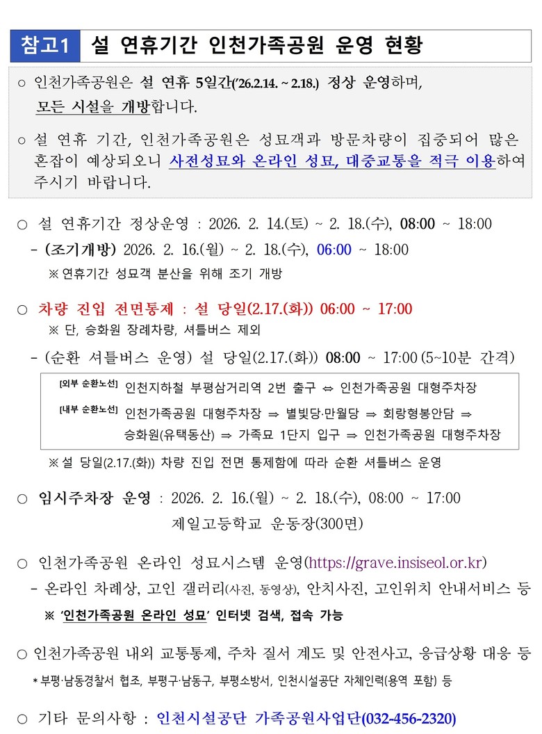 특히 2월 17일 설 당일에는 성묘객의 이동 편의를 위해 인천가족공원 내외부를 순환하는 무료 셔틀버스 10대를 오전 8시부터 오후 5시까지 운영하며, 노선은 외부순환과 내부순환으로 구분해 운행한다.