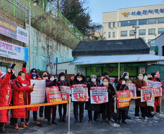 중앙선관위 관악청사 정문 앞에서 ‘불공정 여론조사를 시정하고 공정한 선거운동을 보장하라!’고 촉구하는 허경영 국가혁명당 지지자 박경하씨 등 4명 중 2명이 경찰에 1월 17일 체포되는 초유의 사테에 대해 선관위는 책임을 통감해야 한다.