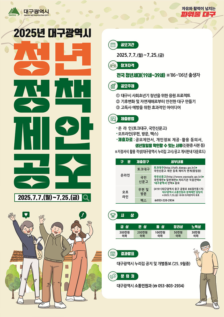 ▸ 대구시 사회초년생 지원, 고독사 예방 등 시정 주요 현안 주제 [대구 세계타임즈=한윤석 기자] 대구광역시는 전국 청년세대(19~39세)의 창의적인 아이디어를 시정에 적극 반영해 정책의 효과성을 제고하기 위해 ‘2025년 대구광역시 청년 정책제안 공모’를 추진한다.
