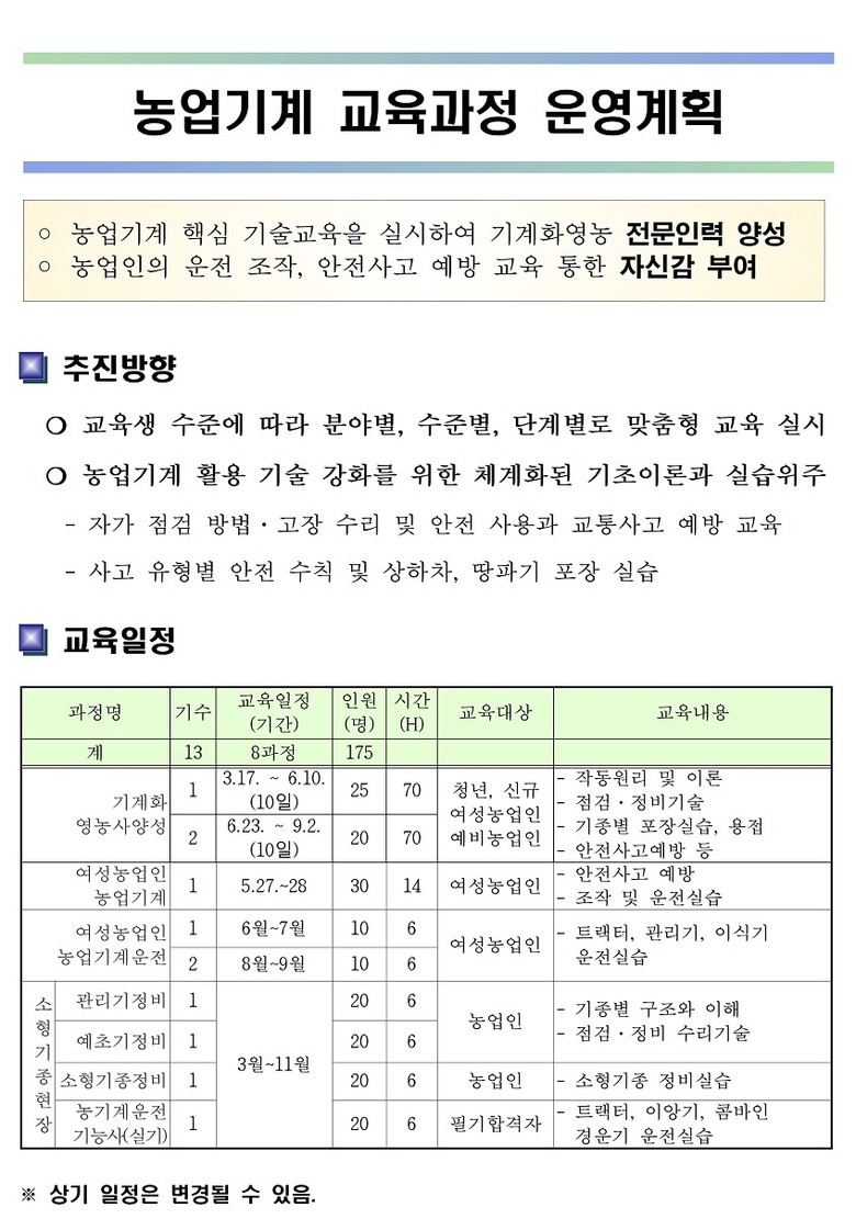 또한, 밭작물 농업기계정비 교육을 연중 실시로 확대하고, 교육생을 40명에서 60명으로 늘려 관리기·예초기 등‘소형기종에 대한 현장정비 교육’으로 강화할 계획이다.