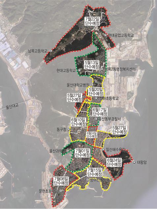 상수관망 블록 고립 확인 위해 순차적 단수 진행 [울산 세계타임즈=이호근 기자] 울산시 상수도사업본부는 오는 5월 13일부터 7월 23일까지(6월 3일 대통령선거일 주 제외) 매주 화요일 오후 11시 50분부터 수요일 오전 5시까지 5시간 가량 동구 전 지역 단수를 순차적으로 진행한다고 밝혔다.