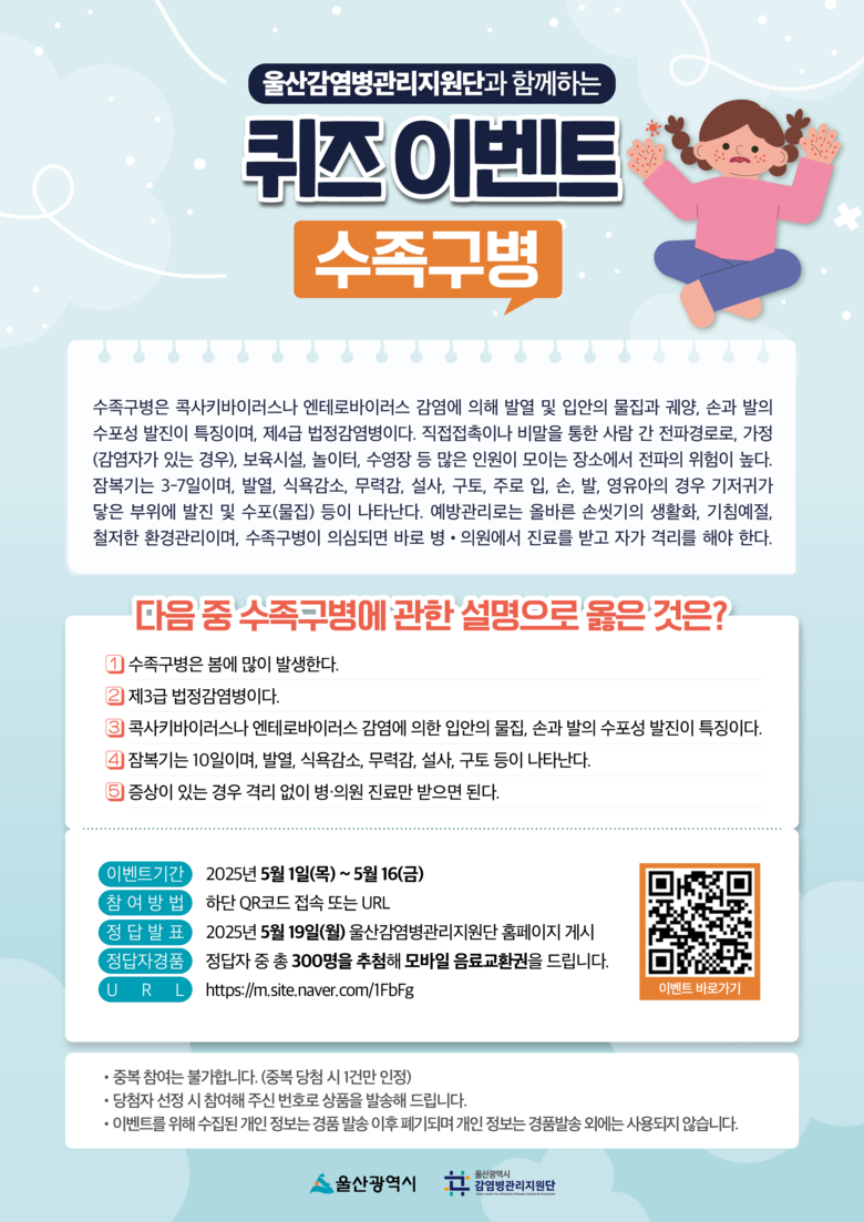 계절성 감염병 예방 시민의식 개선 및 예방 수칙 홍보 [울산 세계타임즈=이호근 기자] 울산시는 감염병관리지원단과 공동으로 5월 1일(목)부터 5월 16일(금)까지 계절성 감염병(수족구병) 예방 시민의식 제고와 예방 수칙 홍보를 위한 감염병 예방 온라인 퀴즈 행사(이벤트)를 진행한다고 밝혔다.