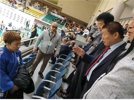 | ▲서정복 회장이 유도경기 후 선수를 격려해 주는 모습 |