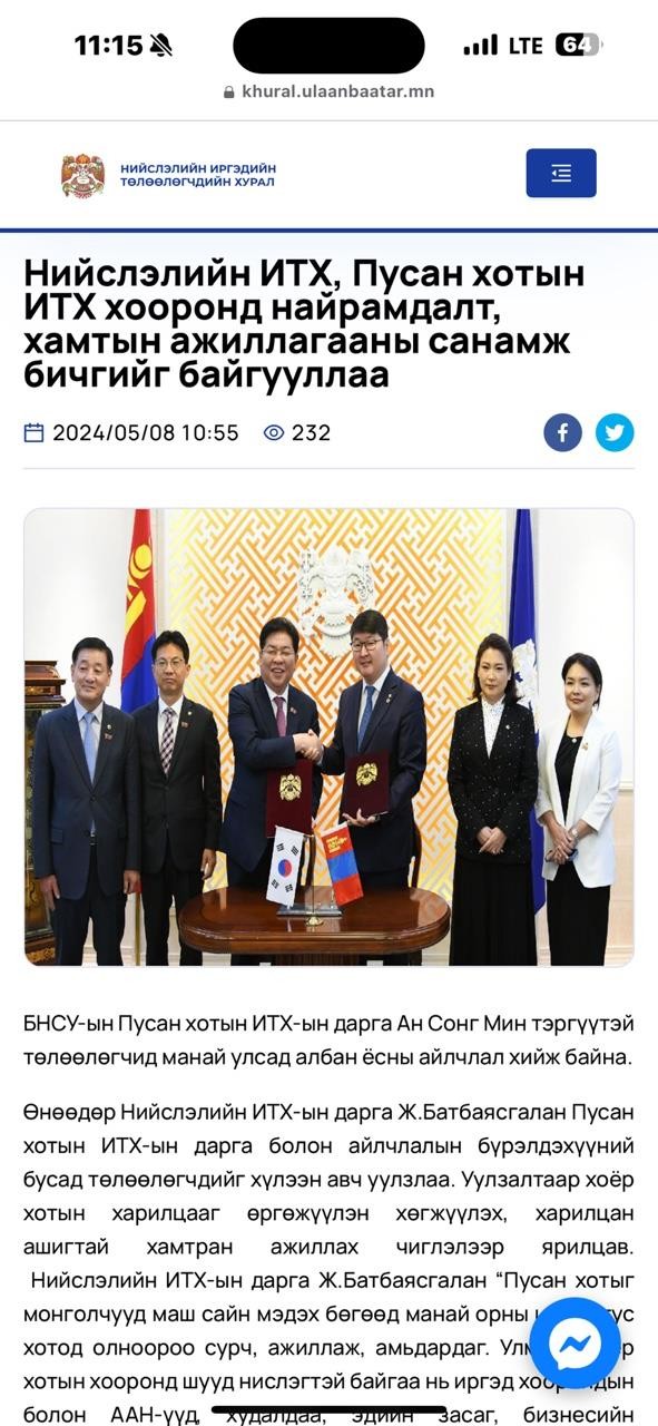[부산 세계타임즈=이용우 기자] 부산광역시의회 몽골 울란바토르 방문 대표단(단장 안성민 부산광역시의회 의장, 이하 대표단)은 5월 10일 현재, 5월 7일(화)부터 5월 11(토)까지 4박 5일의 짧은 방문 일정을 역동적으로 소화하고 있다.